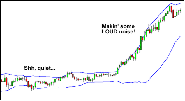 নিচের চার্টটি দেখুন। যখন মার্কেট শান্ত ছিল, তখন ব্যান্ড ২টি কাছাকাছি ছিল। কিন্তু যখন প্রাইস খুব দ্রুত বেড়ে গেছে অর্থাৎ মার্কেট অশান্ত হয়ে গেছে, তখন ব্যান্ড ২টি দূরে সরে গেছে।